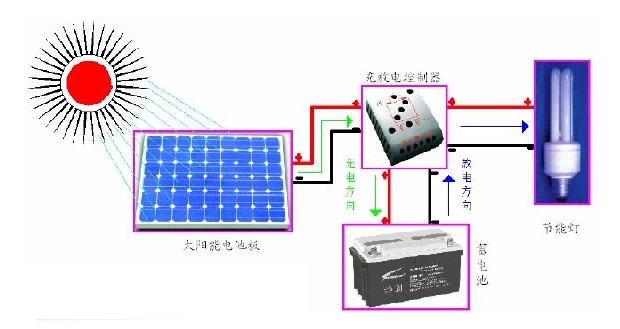 系统工作原理简单,利用光生伏特效应原理制成的太阳能电池白天太阳能电池板接收太阳辐射能并转化为电能输出,经过充放电控制器储存在蓄电池中,夜晚当照度逐渐降低至10lux左右、太阳能电池板开路电压4.5V左右,充放电控制器侦测到这一电压值后动作,蓄电池对灯头放电。蓄电池放电8.5小时后,充放电控制器动作,蓄电池放电结束。充放电控制器的主要作用是保护蓄电池。
