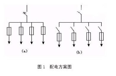 传统的终端配电箱典型的结线方案主要有两种,如图1所示,一是电源经(DZ10 型或DZ20 型)空气断路器(有的还增加熔断器)后进入配电箱的母线,输出各路均经熔断器,如图1 方案(a);二是电源经空气断路器进入配电箱的母线,输出各路均由闸刀开关(也可以为DZ10 型或DZ20 型空气断路器和熔断器)控制,如图1 方案(b)。电源进线的空气断路器主要作为电源的通断的操作和后级短路保护之用,为防止电路发生较小电流短路时空气断路器不能可靠快速动作,增设了各路出线的熔断器,各路出线的闸刀开关主要作为隔离开关,方案(a)中的各路出线熔断器也可以兼顾隔离开关的功能。在图1 的配电方案(b)也有使用DZ 型空气断路器作为出线开关。对于小容量终端配电,这些组合、结线方案主要存在如下不足: