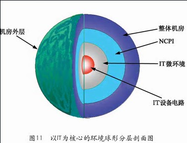从图中可以看出,NCPI是置于整体机房之内的第二环境,IT就是核心。图11用一个球形分层包裹图形象地说明了它们之间的关系。由此也可以看出,整体机房和NCPI不是一回事,一来是它们的结构不同,二来是它们的作用也不同。整体机房是一个营造大环境的机构,而NCPI则是在大环境庇护下的小环境机构,它们是不可分割的依附关系,而且共同服务的最终目标是建立IT微环境。微环境才是直接保证IT可靠工作的机构。所谓微环境就是指IT设备内元器件所处的环境,这个环境直接决定它们的可靠性。可见人们为了实现数据中心的高可靠性和高可用性所付出的工作量和资金耗费是巨大的。