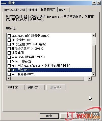 下面我们点“服务和端口”设置服务器允许对外提供PPTP VPN服务,在“服务和端口”界面里点“VPN网关(PPTP)”,在弹出的“编辑服务”对话框中进行如下图设置;