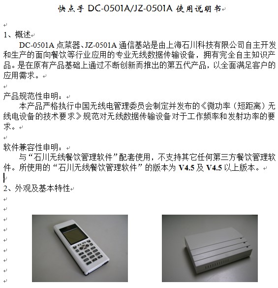 DC-0501A点菜器、JZ-0501A通信基站是由上海石川科技有限公司自主开发和生产的面向餐饮等行业应用的专业无线数据传输设备,拥有完全自主知识产品。是在原有产品基础上通过不断创新而推出的第五代产品,以全面满足客户的应用需求。