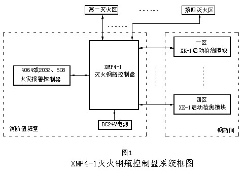 XMP4-1灭火钢瓶控制盘(简称控制盘)与JB-QG-4064或JB-LGZ-YBZ2032、JB-QB-508等火灾报警控制器(简称报警器)、XK-1启动检测模块、XA-1消防急启急停按钮等设备联合使用,组成完整的火灾报警、灭火系统。及时探测火情,发出声、光报警,喷洒灭火气体,迅速而有效地控制火情,实现灭火功能。