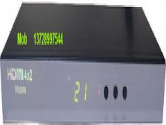 新版HDMI矩阵,4进2出_4X2,深圳HDMI矩阵厂家深圳雨涵科技有限公司最新研发的HDMI矩阵4X2带USB接口,支持RS232协议,支持红外延长功能,前面板采用数码显示,外形靓丽,指示灯光线柔和.毫不刺眼.这款新版的HDMI矩阵特别受到买家的亲睐.HDMI矩阵新方案4X2产品操作指南:A. 重启或者复位时,会默认输入信号1.。B. 状态显示灯;当其中一个信号源或者信号输出端处于工作状态的时候,相对应的LED灯会亮。当任意一个信号源切换到某一个信号输出端时,与信号源相对应的LED灯会变亮。C. 无信号损失D. 安装简单E. 外置5V/2A的电源适配器. 雨涵HDMI矩阵新方案4X2基本参数.1. 四路HDMI信号输入切换或分配到两个HDMI 信号端2. 任意一个信号端都可以通过光纤或者立体声耳机实现音频独立输出3. 兼容HDCP 1.24. 支持HDMI-CEC5. 支持36位真彩6. 支持蓝光DVD24/50/60fs/HD-DVD/xvYCC7. 支持音频格式DTS-HD/Dolby-trueHD/LPCM7.1/DTS/DOLBY-AC3/DSD8. 支持信号时序重整9. 使用AWG26 HDMI 1.3版本的标准线缆,输入传输距离可达15米,输出传输距离可达25米。10.HDMI矩阵4X2输入端可以通过红外线进行遥控切换,也可以直接摁按钮进行控制。11.HDMI矩阵新方案前面板采用数码管显示,光线柔和,毫不刺眼.12.带USB接口支持RS232协议,与PC同步.方便操作 以上是HDMI矩阵4X2的详细信息,如果您对HDMI矩阵4X2的价格、厂家、型号、图片有什么疑问,请联系我们获取RS232雨涵HDMI矩阵4X2的最新信息。