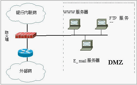 为适应当前银行计算机网络发展趋势,保护银行内部网络,防止发生来自内部的安全攻击,银行计算机网络要求将内部网络划分为受严格保护的内部网络和DMZ(非军事区),防止因系统提供的对外服务存在不安全因素给内部网络带来安全隐患。银行内部网络是被保护的安全区,它不对外开放,也不对外提供任何服务,外部用户检测不到它的IP地址。DMZ又称非军事化区,它对外提供服务,系统开放的信息都放在该区,由于它的开放性,常成为黑客攻击的对象,存在一定的安全隐患。DMZ区可放置存在安全隐患的Email 服务器、FTP 服务器、WWW 服务器等。为提高内部网络的安全,防止外部黑客通过DMZ进入内部网络,必须将内部网与DMZ分开。内部网络是需要严格保护的系统,需要制定相对严格的安全策略。在这种结构框架下,用户可以灵活地针对每个区域的具体安全需求和实际情况制定相应的安全策略。图1是用具有DMZ功能的防火墙构建银行计算机网络的安全体系框架。