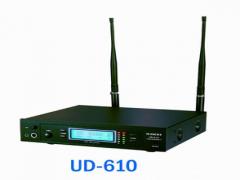 - Squ lch静噪调节功能,可调整SQ电平,改善外来噪声所造成的干扰。注:SQ调太深时,接收距离会变短。UD-610接收机型号:UD-610/UD-620载波频率范围:UHF 520-928MHz机壳:铁壳震荡方式:PLL相位锁定合成回路接收模式:双谐调分集接收频率稳定度:+-0.005%接收干度:在5UV时,超过80DB信噪比假象谐波:80DB选择性:〉50解调模式:FM中频频率:第一中频:56MHZ;第二中频:10.7MHZ动态范围:96DB音频锁定:2.768KHZ信噪比:〉94DB(在天线端输入60DBUV偏移度为48KHZ音频响应:50HKZto15khz综合失真:〈1%(在1KHZ时)电压供应:DC 12V音频输出:Balanced Unbalanced最大消耗电流:UD-610 300mA UD-620 630Ma尺寸mm:UD-610:210*44*180 UD-620 420*44*180