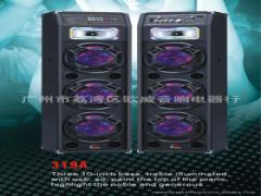 型号:319A红蜻蜓出新款啦!!!!!!红蜻蜓音响319A是我们精选的机型,音质出色,功率大,3个10寸低音炮+功放+专业双话筒接口+USB/SD/MMC卡接口+吉他输入接口+动态灯效功能性价比非常高,外观时尚大方,是您不错的选择,对于品质我们非常有信心,我们承诺一个月包换,一年保修,请您放心购买。本机特点介绍:★带USB接口和SD/MMC接口,方便播放移动存储设备中MP3音乐格式;★2.0全木制高保真音箱系统,不锈钢包角,铁网罩保护,整个音箱用料很足,非常结实,很适合户外使用;★专业双话筒接口,带话筒音量和混响调节,K歌专业设备;★专业吉他输入接口,带吉他音量和混响调节,舞台演出专业设备;★音响功率大,超重低音非常出色,操作界面很人性化,操作简单方便;实用范围:礼仪 婚庆 娱乐室音响,专业舞台演出音响,DJ音响,商铺音响等等产品图片展示单元配置:10低音*6+号角高音*2250W+250W环流变压器5198东芝对管大功率,顶部烤漆带USB/SD接口,电镀白金包角,七彩灯DJ网用黑色喷漆产品细节图片展示产品主机正面全景电源开关彩灯高音:炫酷号角高音四周的灯效,会随着音量大小闪烁背面图:背部音频输入电源开关FM功能接收天线侧面把手设计,方便移动DJ彩灯网: 实木中纤板6个双10寸DJ喇叭带七彩炫灯+2个号角高音,大功率300W,顶部烤漆带USB/SD接口,吉它功能,EQ均衡调节,电镀白金包角,两件/套包装:两件单包产品质量保证,国家CCC强制性认证 让消费者放心购买广州市荔湾区欧威音箱设备厂是一家集生产加工、经销批发的私营独资企业,主营家庭影院音箱、专业舞台音箱、多媒体音响、2.1音柱、5.1家庭影院、KTV功放音箱等产品。拥有专业研发人才队伍,以ISO9000为质量保证体系标准。公司秉承“以科技创新求效益,以质量求生存,以诚信谋发展”的经营理念,营造出具有高性价比、科技含量高、款式流行的产品,给客户一个坚强的后盾。 公司产品畅销中国内地,远销港台、东南亚、非洲、中东等国家和地区,并赢得了良好的声誉。公司旗下品牌(红蜻蜓)(漫威)已通过国家3C认证。本公司实力雄厚,规模宏大,热诚欢迎国内外客商光临惠顾,洽谈合作。愿与你一起携手共进,共创辉煌。