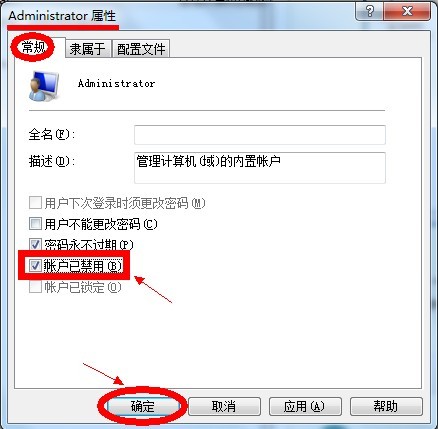 - 这时打开了“Administrator 属性”的界面,在“常规”选项下将“账户已禁用”的勾去掉,这样就开启了Administrator(管理员)账户