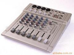 技术参数6通道输入(4路话筒+2路立体声)另带2路立体声的辅佐输入(AUX IN)及2路立体声(REC OUT)和1路单声(AUX SEND)返回输出,2路输出(R & L);迷你型设计,具有精美的外观及携带方便;带耳机(PHONES)监控输出,并有专门的FADER来控制信号大小,使操作更加方便;自带48V话筒供电,可以与各种类型话筒匹配;外置式电源和话筒噪音滤波器(80Hz),有效的抑制了话筒录音或处理过程中产生的噪音和失真(MIC NOISE<-129dBu, THD:<0.0068%);高/中/低EQ均衡调节,享受完美的均衡效果;多种连接口(MIC/LINE/RESEND/PLAYBACK/RECORD等),是家庭影院录音室和乐队的最佳装备。