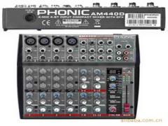PHONIC 丰力克 AM 440D4路麦克风/高电平立体输入的小型调音台4路单声道麦克风/高电平声道4路立体通道控制室/耳机声源矩阵单独监听每声道的EFX/AUX 输出选听开关重量:3.80 lbs高保真超低噪音4路单声道麦克风/高电平声道4路立体通道每通道有辅助输出单通道设有75Hz的高通滤波器每通道设有3段EQ麦克风声道供有+48V 幻象电源控制室/耳机声源矩阵单独监听每声道的EFX/AUX 输出选听开关平衡主输出选配支架AM系列为小型多功能的调音台, 它有5-24个mono 麦克风/高电平和立体输入的声道小型多功能混音器. 在录音或增强声音运用中具有高保真音质的输出, 得益于超低噪音的前置扩大器.高通滤波器有效地消除了多余的杂音,如隆隆声, 爆破声, 风噪声和回音.在多段EQ,DFX, 两组电平表和高音量耳机输出的帮助下,用户可以随心所欲地驾驭调音台. 经辅助输出和辅助倒送迷你立体声I/O为调音台增色不少,使其与MP3,MD或计算机音响录音设备完美地结合.