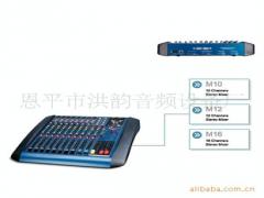 产品名称:混合型调音台M系列产品型号:M10/M12/M16产品说明:M10:便携式调音台,6路单声,2路立体声,单声道具有中频扫频,两组辅助发送,内置数字效果器,通道哑音,48V幻像电源,100mm精密推拉电位器。M12:便携式调音台,8路单声,2路立体声,单声道具有中频扫频,两组辅助发送,内置数字效果器,通道哑音,48V幻像电源,100mm精密推拉电位器。M16:便携式调音台,12路单声,2路立体声,单声道具有中频扫频,两组辅助发送,内置数字效果器,通道哑音,48V幻像电源,100mm精密推拉电位器。M Series has advantage as follow: smart appearance, small size, full functions, ect.it is suitable in recordings sudio, conference room, school broadcasing.Features(产品特征)· 6、8、12mono, 2 stereo input· Double layer PCB with SMT ensures the reliability· 100mm high-precision & long-life handspike attenuator· Professional INSERT points for external processing· Special SOLO system on separate track with control of individual channel level· +48V phantom power· 3 band EQ, MF sweeping from 140 Hz to 3 KHzSpecification(规格说明)最大输出电平:20dBm (1KHz, THD=0.5%)剩余噪声:-85dB信噪比:85dB等效噪声源输入电动势:-128dBm耳机输出功率:4300mw(1KHz, THD=0.5%, 00Ω)均衡:低频80Hz ±15dB中频140Hz~3KHz ±15dB高频12KHz ±15dB增益控制:MONO(单声道)+5dB~+60dBSTEREO(立体声)-10dB~+20dB频率响应:20Hz~20KHz(±0.5dB)总谐波失真+噪声:≤0.007% (1KHz, 0.775V)M10毛重(kg):7净重(kg):5包装尺寸(mm):560×505×155外型尺寸(mm):450×416×97M12毛重(kg):8.6净重(kg):5.7包装尺寸(mm):535×540×155外型尺寸(mm):450×470×97M16毛重(kg):9.5净重(kg):6.5包装尺寸(mm):560×625×155外型尺寸(mm):450×524×97混合型调音台M系列两编组调音台系列超薄型调音台系列带功放调音台系列混合型调音台MD系列调音台 调音台又称调音控制台,它将多路输入信号进行放大、混合、分配、音质修饰和音响效果加工,是现代电台广播、舞台扩音、音响节目制作等系统中进行播送和录制节目的重要设备。调音台按信号出来方式可分为:模拟式调音台和数字式调音台。调音技巧 调音台在输入通道数方面、面版功能键的数量方面以及输出指示等方面都存在差异,其实,掌握使用调音台,要总体上去考察它,通过实际操作和连接,自然熟能生巧。调音台分为三大部分:输入部分、母线部分、输出部分。母线部分把输入部分和输出部分联系起来,构成了整个调音台。调音台种类 根据使用目的和使用场合的不同,调音台分为以下几种: (1) 立体声现场制作调音台(Stereo Field Production Console) (2) 录音调音台(Recording Console) (3) 音乐调音台(Music Console) (4) 数字选通调音台(Digital Routing Mixing Console) (5) 带功放的调音台(Powered Mixer) (6) 无线广播调音台(On Air Console) (7) 剧场调音台(Theatre Console) (8) 扩声调音台(P.A. Console) (9) 有线广播调音台(Wired Broadcast Mixer) (10) 便携式调音台(Compact Mixer)调音台输入部分的插座 ① 卡侬插座MIC:此即话筒插座,其上有三个插孔,分别标有1,2,3。标号1为接地(GND),与机器机壳相连,把机壳作为0伏电平。标号2为热端(Hot)或称高端(Hi),它是传送信号的其中一端。标号3为冷端(Cold)或称低端(Low),它作为传输信号的另一端。由于2和3相对1的阻抗相同,并且从输入端看去,阻抗低,所以,称为低阻抗平衡输入插孔。它的抗干扰性强,噪声低,一般用于有线话筒的连接。 ②线路输入端(Line):它是一种1/4"大三芯插座,采用1/4"大三芯插头(TRS),尖端(Tip)、环(Ring)、套筒(Sleeve),作为平衡信号的输入。也可以采用1/4"大二芯插头(TS)作为非平衡信号的输入。其输入阻抗高,一般用于除话筒外的其他声源的输入插孔。 ③插入插座(INS):它是一种特殊使用的插座,平时其内部处于接通状态,当需要使用时,插入1/4"大三芯插头,将线路输入或话筒输入的声信号从尖端(Tip)引出去,经外部设备处理后,再由环(Ring)把声信号返回调音台,所以,这种插座又称为又出又进插座,有的调音台标成“Send/Return”或“in/out”插座。 ④定值衰减(PAD):按下此键,输入的声信号(通常是对Line端输入的声信号)将衰减20dB(即10倍),有的调音台,其衰减值为30dB。它适用于大的声信号输入。 ⑤增益调节(Gain):它是用来调节输入声信号的放大量,它与PAD结合可使输入的声信号进入调音台时处于信噪比高、失真小的最佳状态,也就是可调节该路峰值指示灯处于欲亮不亮的最佳状态。 ⑥低切按键(100Hz):按下此键,可将输入声信号的频率成分中100Hz以下的成分切除。此按键用于扩声环境欠佳,常有低频嗡嗡声的场合和低频声不易吸收的扩声环境。 ⑦均衡调节(EQ):它分为三个频段:高频段(H.F.)、中频段(M.F.)、低频段(L.F.),主要用于音质补偿。 a.高频段(H.F.):倾斜点频率为10kHz,提衰量为?15dB,这个频段主要是补偿声音的清晰度。 b. 中频段(M.F.):中心频率可调,范围为250Hz?8kHz;峰谷点的提衰量为?15dB;这个频段的范围很宽,补偿是围绕某个中心频率进行。若中心频率落在中高频段,提衰旋钮补偿声音的明亮度。若中心频率落在中低频段,提衰旋钮补偿声音的力度。 c.低频段(L.F.):倾斜点频率为150Hz,提衰量为?15dB,这个频段主要用于补偿声音的丰满度。 ⑧ 辅助旋钮(AUX1/AUX2/AUX3/AUX4):调节这些辅助旋钮,等于调节该路声音送往相应辅助母线的大小其中AUX1和AUX2的声信号是从推子(Fader)之前引出的,不受推子影响。AUX3和AUX4的声信号是从该路推子(Fader)之后引出的,受推子大调节的影响。前者标有Pre,后者标有Post。 ⑨声像调节(PAN):它用于