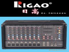 日高(RIGAO)舞台、卡拉OK专业音响 性能特点: (1)8路平衡、非平衡输入带功放木箱调音台,各路输入可进行 高、中、低音,混响,辅助,耳机监听等独立调节; (2)多组外接输出信号输出接口,平衡与非平衡输入接口,音乐 直通多种信号接插方式; (3)双七段频率均衡器,可随心所欲调节各频段,双六段频谱显 示,显示直观、动感; (4)特设幻像电源,专供大小会议演讲的话筒使用; (5)附设耳机监听、辅助监听功能,内置混响效果器,2路编组 放大信号输出,平衡与非平衡外接输出接口,过流电路保 护,大容量滤波电解; (6)温控型散热风扇,散热效果佳; (7)大电流供电变压器; (8)便携式木箱体结构,更适合野外活动使用。 技术参数: 功率: 150W+150W 麦克风: -60dB 立体声声道输入: ~40dB 辅助信号发送: ~20dB 效果信号返回: ~20dB 信噪比: 80dB 谐波失真: ≤0.17% 1KHz 高音: ±15dB/10KHz 中音: ±15dB/500Hz~3KHz 低音: ±15dB/60Hz 电压要求: AC220V/50Hz