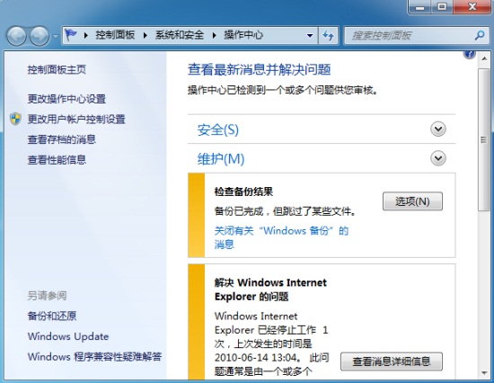 操作中心列出有关需要您注意的安全和维护设置的重要消息。操作中心中的红色项目标记为“重要”,表明应快速解决的重要问题,例如需要更新的已过期的防病毒程序。黄色项目是一些应考虑面对的建议执行的任务,例如所建议的维护任务。