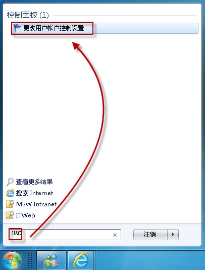 我们可以在开始菜单的搜索框中输入 UAC,在开始菜单中就会显示出搜索结果“更改用户账户控制设置”,如图所示: