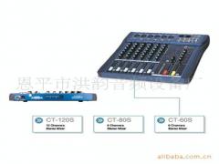 产品名称:超薄型调音台CT系列产品型号:CT-60S/CT-80S/CT-120S产品说明:CT-60S:超薄型设计, 6路单声,通道三段均衡,一组辅助发送,一组效果发送,内置数字效果器, 60mm精密推拉电位器。CT-80S:超薄型设计, 8路单声,通道三段均衡,一组辅助发送,一组效果发送,内置数字效果器, 60mm精密推拉电位器。CT-120S:超薄型设计, 12路单声,通道三段均衡,一组辅助发送,一组效果发送,内置数字效果器, 60mm精密推拉电位器。CT series has advantages as follow: simple structure, stable capability,and easy operation. CT series is used in middle or small conference room,broadcasting studio etc.Features(产品特征)· 6、8、12-group mono track input, high-quality microphone amplifier· 3-band frequency input· High-precision & dual color level LED, control output level correctly· 60mm high-precision & long-life handspike attenuator· Internal professional digital effect processor· MIC monitor output· Record outputSpecification(规格说明)最大输出电平:19dBm (1KHz, THD=0.5%)剩余噪声:-105dB信噪比:≥80dB等效噪声源输入电动势:-115dBm耳机输出功率:100mw(1KHz, THD=0.5%, 200Ω)均衡:低频80Hz ±15dB中频2.5KHz ±15dB高频12KHz ±15dB增益控制:MONO(单声道)-60dB ~-40dBTAPE(磁带卡座)-∞~0dB频率响应:20Hz~20KHz(±3dB)总谐波失真+噪声:≤0.03% (1KHz, 0.775V)CT-60S毛重(kg):4.4净重(kg):2.9包装尺寸(mm):440×395×120外型尺寸(mm):480×355×48CT-80S毛重(kg):5.1净重(kg):3.4包装尺寸(mm):440×440×120外型尺寸(mm):480×410×48CT-120S毛重(kg):6.5净重(kg):4.4包装尺寸(mm):440×485×120外型尺寸(mm):480×520×48调音台 调音台又称调音控制台,它将多路输入信号进行放大、混合、分配、音质修饰和音响效果加工,是现代电台广播、舞台扩音、音响节目制作等系统中进行播送和录制节目的重要设备。调音台按信号出来方式可分为:模拟式调音台和数字式调音台。调音技巧 调音台在输入通道数方面、面版功能键的数量方面以及输出指示等方面都存在差异,其实,掌握使用调音台,要总体上去考察它,通过实际操作和连接,自然熟能生巧。调音台分为三大部分:输入部分、母线部分、输出部分。母线部分把输入部分和输出部分联系起来,构成了整个调音台。调音台种类 根据使用目的和使用场合的不同,调音台分为以下几种: (1) 立体声现场制作调音台(Stereo Field Production Console) (2) 录音调音台(Recording Console) (3) 音乐调音台(Music Console) (4) 数字选通调音台(Digital Routing Mixing Console) (5) 带功放的调音台(Powered Mixer) (6) 无线广播调音台(On Air Console) (7) 剧场调音台(Theatre Console) (8) 扩声调音台(P.A. Console) (9) 有线广播调音台(Wired Broadcast Mixer) (10) 便携式调音台(Compact Mixer)调音台输入部分的插座 ① 卡侬插座MIC:此即话筒插座,其上有三个插孔,分别标有1,2,3。标号1为接地(GND),与机器机壳相连,把机壳作为0伏电平。标号2为热端(Hot)或称高端(Hi),它是传送信号的其中一端。标号3为冷端(Cold)或称低端(Low),它作为传输信号的另一端。由于2和3相对1的阻抗相同,并且从输入端看去,阻抗低,所以,称为低阻抗平衡输入插孔。它的抗干扰性强,噪声低,一般用于有线话筒的连接。 ②线路输入端(Line):它是一种1/4"大三芯插座,采用1/4"大三芯插头(TRS),尖端(Tip)、环(Ring)、套筒(Sleeve),作为平衡信号的输入。也可以采用1/4"大二芯插头(TS)作为非平衡信号的输入。其输入阻抗高,一般用于除话筒外的其他声源的输入插孔。 ③插入插座(INS):它是一种特殊使用的插座,平时其内部处于接通状态,当需要使用时,插入1/4"大三芯插头,将线路输入或话筒输入的声信号从尖端(Tip)引出去,经外部设备处理后,再由环(Ring)把声信号返回调音台,所以,这种插座又称为又出又进插座,有的调音台标成“Send/Return”或“in/out”插座。 ④定值衰减(PAD):按下此键,输入的声信号(通常是对Line端输入的声信号)将衰减20dB(即10倍),有的调音台,其衰减值为30dB。它适用于大的声信号输入。 ⑤增益调节(Gain):它是用来调节输入声信号的放大量,它与PAD结合可使输入的声信号进入调音台时处于信噪比高、失真小的最佳状态,也就是可调节该路峰值指示灯处于欲亮不亮的最佳状态。 ⑥低切按键(100Hz):按下此键,可将输入声信号的频率成分中100Hz以下的成分切除。此按键用于扩声环境欠佳,常有低频嗡嗡声的场合和低频声不易吸收的扩声环境。 ⑦均衡调节(EQ):它分为三个频段:高频段(H.F.)、中频段(M.F.)、低频段(L.F.),主要用于音质补偿。 a.高频段(H.F.):倾斜点频率为10kHz,提衰量为?15dB,这个频段主要是补偿声音的清晰度。 b. 中频段(M.F.):中心频率可调,范围为250Hz?8kHz;峰谷点的提衰量为?15dB;这个频段的范围很宽,补偿是围绕某个中心频率进行。若中心频率落在中高频段,提衰旋钮补偿声音的明亮度。若中心频率落在中低频段,提衰旋钮补偿声音的力度。 c.低频段(L.F.):倾斜点频率为150Hz,提衰量为?15dB,这个频段主要用于补偿声音的丰满度。 ⑧ 辅助旋钮(AUX1/AUX2/AUX3/AUX4):调节这些辅助旋钮,等于调节该路声音送往相应辅助母线的大小其中AUX1和AUX2的声信号是从推子(Fader)之前引出的,不受推子影响。AUX3和AUX4的声信号是从该路推子(Fader)之后引出的,受推子大调节的影响。前者标有Pre,后者标有Post。 ⑨声像调节(PAN):它用于调节该路声源在空间的分布图像。当往左调节时,相当于把该路声源放在听音的左边。当往右调节时,相当于把该路声源放在听音的右边。若把它置于中间位置时,相当