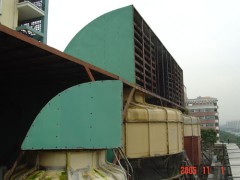 控制冷却塔排风扇进出气口噪声,可在冷却塔进排风处安装特制消声器。对进排气口噪声突出的冷却塔,此方法降噪效果明显;