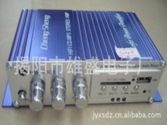 QQ:183921975联系电话:13434939321 13500165797▲采用汽车音响专用的功放模块,立体声放大;▲制作精美,落足本钱;USB/SD插口可接U盘或SD卡,清淅播放MP3音频文件。▲带4欧喇叭瞬时最大功率可达75W,动态好,音色美;▲带音量调节、高低音调节和电源开关,夹持式喇叭输出端子,输入同时有RCA(莲花插座)信号输入端子及3.5MP3插口;▲直流12V电源;▲尺寸:15.4CM*10CM*4.2CM;▲蓝/古铜色全铝合金外壳,豪华大气; 适合摩托车、汽车安装使用,也非常适合于作为个人音响或床头音响的功放使用。 配合CD、MD、MP3、MP4、ipod、MP3手机、卡带机等设备使用,是非常不错的选择!其它热销产品 本厂十多年来主要从事各种电源适配器、监控电源、音响器材的开发、设计、生产和销售。品样齐全、质量优、价格实惠。产品同时可来样定做、加工。