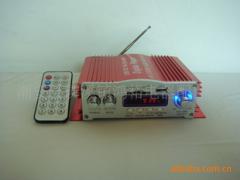 | 优质带USB/SD/FM 收音功能插卡 12V 迷你功放背面色彩、音量调节USB/SD/MMC卡声音模式,数字显示高低音调节键盘 |