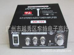 产品说明:产品名称:带收音机立体声功放机产品型号:AK-104标称功率:180W+180W音乐峰值功率:60W+60W不失真功率:15W+15W (4Ω负载时)电源:220V50Hz高低音调节:有FM收音机:有MP3输入:有包装:纸盒大箱装箱数量:20台/箱企业介绍 Company Profile 特力音响是一家专业从事现代影音设备生产的制造企业,产品涉及家庭影院系统的功放机、音箱、喇叭以及舞台音响设备(专业音响)、多媒体有源音箱、汽车音响等各个领域。本厂拥有自己独立的电子生产车间,车间全部采用具有先进水平的生产设备,同时严格按照质量管理体系进行全局跟踪管理。一条龙式的规模化大生产加上先进的企业管理模式确保了成本在下降、效益在增长。 我厂始终坚持以管理出效益、以质量求发展;始终坚持以科技兴业、以科技打造精品音响。我们汇聚了一批国内音响行业的优秀电子、电声工程师,每件产品从外观设计到工艺雕琢、从研发生产到质量把关都凝聚了专业人才的精心工作。强大的开发能力、出众的产品质量、完善的售后服务不仅赢得了众多的消费者,也成为国内不少知名企业指定的配套生产企业,同时还赢得了众多的海外OEM、ODM客户。 展望未来,特力人充满了必胜的信心,全体员工都时刻牢记“实实在在做人,认认真真做事”的企业宗旨,在各自的岗位上兢兢业业,诚恳工作,同时不断钻研以创新、不断学习以上进,为迎合公司大跨步发展而时刻努力着。Teli electron factory is aprofessional production enterprise that is engage in modern shadow sound equipment production,product the merit that is concerned with the system offamily cinema put machine,sound box,trumpet as well as stage acoustic equipment (professional acoustics),multi-media have every fields such as source sound box and automobile acoustics. This factory possesses self independent electronic production vehicle, workshop all adoptings have the production equipment of advanced level,at the same time carry oout overall situation strictly according to quality management system to trail management.The scale of the type of a connected sequence melt big production add advanced froup melt the pattern of business management have ensured cost in drop,benifitin increase. My factory insists to make benifit with management all along,begs to develop with quality;lnsist to hit with the mood trade of science and technology,with scienceand technology to make elaboration acoustics all along. Us have gathered together the excellent electronic,electroacoustic engineer of a batch of domestic acoustic profession,each product is carved from appearance design to technology,form research and develop production go to quality guard a pass to condense professional talentworkmeticulously.Powerful development ability,outstanding product quality and perfect post sale service have not only won numerous customer,also become the domestic supplemental production enterprise ofdesignated a lot of famous enterprises,have at the same time still won numerous overseas OEM and ODM customer. Look ahead into the future, Teli person have filled with surely the confidence of victory, all employee remenbers the enterprise purpose of "behave really,work carefully"constantly,on the post of each company,sincere work is atthe same time dug into continuously in order to creat study continuously more enter,to cater to company,try hard constantlyacross step development.
