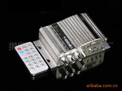 数字型不同模拟型就是高清全保真输出声音数字高清全保真发烧点迷你功放机CD,USB,SD读卡功能产品名称:数字迷你功放机T-2020MKII带usb和读卡器的多功能小功放机产品介绍升级版T-2020MKII带usb和读卡器的多功能小功放机简述:1,外壳:全铝2,颜色:银灰色.3,前面:高音、低音、音量,音源切换开关,上一曲(音量-),下一曲(音量+),右上角:SD卡,USB内存卡输入插口。4,后面:有电源开关,高品质RCA输入插座,线夹接线是左右声道输出,DC12-20V直流电输入.5,有发烧级功放的血统6,独特之处是拥有40W黄金瓦数的高保真。7,音量电位器采用台湾富华原厂的B100K*2,耐用,信号衔接顺畅,音靓的同时起了重要的环节。8,前级采用日本原装进口JRC 4558D,是一款稳定的立体声运放,放大部分采用ST公司的核心系列-STA540SA,神话般演泽了ST公司的历史故事---完美无暇!9,材料用好元器件,来衔接每段线路,绝对超值!10,名牌电容:威马专业音频电容,GSC,SANYO,EVERCOM,日本化工。11,才云T-2020MKII特点:(1)功率大,失真小,音质细腻.开机,关机没有冲击声,没有烦躁的电流声,信噪比控制得非常好的,本芯片还有短路,过热,过载保护!(2) SD卡,USB内存卡 ,工作性能非常稳定,没有冲击声,支持EQ多种音乐模式切换,使用方便易懂!二,功能解说:1;支持全功能遥控;2;支持音响面板按键;3;支持EQ多种音乐模式切换;4;支持断电记忆播放,重复播放等;5;支持MP3/WMA等音频格式;6;高保真音频解码蕊片,HIFI音质体验;7;支持32-320Kbps 的MP3歌曲;8;支持USB接口的内存器/手机/MP3/MP4等音频设备;9;支持SD(MINI-MRICO-SD)/MMC(MMC4.0/RS-MMC/RS-MMC4.0)等内存片进行播放;三,功放部分技术参数:输出功率:40W×2(4Ω) 30W×2(8Ω)频率响应:20Hz-20KHz (+0,-0.15dB)互调失真:0.1% (1KHz,THD,4Ω)输入灵敏度:800mV ( 40W, 4Ω)信 噪 比:98dB功放电压: DC12V-20V *1电源消耗:30W尺 寸:长(138MM),宽(83MM),高(48MM).重量:0.5KG使用范围:书房,汽车、摩托车。MODEL:T-2030Specifications:OUTPUT POWER:40W+40W(8Ω)Fregueney Response:20Hz-20KHz(+0,0.15dB)Harmonic Distortion:0.1%(1KHz、THD、4Ω)Input Signal Sensitirity:800mvSignal-to-Noise Rate:98dBPower Supply:DC12V-20VDimensicons:(L)145mm*(W)113mm*(H)50mmWarm prompt:Please earnestiy check the power amplifier output positve and negatibve whether extremely positive and negative to connect extremely with the sound box correctiy,refuses the short circuit,after determining the connection normally,presses down the power amplifier power switch again,guaranteed that the power amplifier normal work,the achieves the graceful sound effect.[Suggested that matches 4Ω-8Ω sound boxes to be best]Note:Our company reserves the right to product improvement,specifications subject to change without notice.