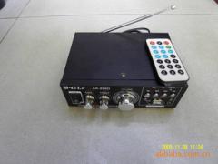 产品说明:产品名称:ACDC立体声读卡收音功放机产品型号:AK-698D标称功率:180W+180W音乐峰值功率:60W+60W不失真功率:15W+15W (4Ω负载时)电源:220V50Hz高低音调节:有MP3输入:有包装:纸盒大箱装箱数量30台/箱企业介绍 Company Profile 特力音响是一家专业从事现代影音设备生产的制造企业,产品涉及家庭影院系统的功放机、音箱、喇叭以及舞台音响设备(专业音响)、多媒体有源音箱、汽车音响等各个领域。本厂拥有自己独立的电子生产车间,车间全部采用具有先进水平的生产设备,同时严格按照质量管理体系进行全局跟踪管理。一条龙式的规模化大生产加上先进的企业管理模式确保了成本在下降、效益在增长。 我厂始终坚持以管理出效益、以质量求发展;始终坚持以科技兴业、以科技打造精品音响。我们汇聚了一批国内音响行业的优秀电子、电声工程师,每件产品从外观设计到工艺雕琢、从研发生产到质量把关都凝聚了专业人才的精心工作。强大的开发能力、出众的产品质量、完善的售后服务不仅赢得了众多的消费者,也成为国内不少知名企业指定的配套生产企业,同时还赢得了众多的海外OEM、ODM客户。 展望未来,特力人充满了必胜的信心,全体员工都时刻牢记“实实在在做人,认认真真做事”的企业宗旨,在各自的岗位上兢兢业业,诚恳工作,同时不断钻研以创新、不断学习以上进,为迎合公司大跨步发展而时刻努力着。Teli electron factory is aprofessional production enterprise that is engage in modern shadow sound equipment production,product the merit that is concerned with the system offamily cinema put machine,sound box,trumpet as well as stage acoustic equipment (professional acoustics),multi-media have every fields such as source sound box and automobile acoustics. This factory possesses self independent electronic production vehicle, workshop all adoptings have the production equipment of advanced level,at the same time carry oout overall situation strictly according to quality management system to trail management.The scale of the type of a connected sequence melt big production add advanced froup melt the pattern of business management have ensured cost in drop,benifitin increase. My factory insists to make benifit with management all along,begs to develop with quality;lnsist to hit with the mood trade of science and technology,with scienceand technology to make elaboration acoustics all along. Us have gathered together the excellent electronic,electroacoustic engineer of a batch of domestic acoustic profession,each product is carved from appearance design to technology,form research and develop production go to quality guard a pass to condense professional talentworkmeticulously.Powerful development ability,outstanding product quality and perfect post sale service have not only won numerous customer,also become the domestic supplemental production enterprise ofdesignated a lot of famous enterprises,have at the same time still won numerous overseas OEM and ODM customer. Look ahead into the future, Teli person have filled with surely the confidence of victory, all employee remenbers the enterprise purpose of "behave really,work carefully"constantly,on the post of each company,sincere work is atthe same time dug into continuously in order to creat study continuously more enter,to cater to company,try hard constantlyacross step development.