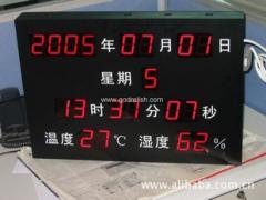 二、显示屏制作方案:1、显示屏尺寸:50CM×35CM×5.5CM;2、显示屏为单面显示,共有19位数码管,数码管全部为1.8英寸红色显示;3、显示屏面板黑面雕白字,显示窗口开孔罩茶玻,边框及后盖板为黑色PVC材料;4、按键四键操作:改数(+)、改数(—)、移位进、移位退,按键装在右边框下侧;5、遥控器为红外遥控,遥控接收头装在前面板右下角(见效果图)6、温湿度模块从右边框上侧引出,引线长1米;7、后盖板上侧打两个钥匙孔做固定用;8、散热孔开在上下边框中间一排及后盖板上下两排,三、功能要求:1、DZ0514显示屏为15位百年历加温湿度混合显示;2、公历范围一百年为2000年~2099年,公历一百年大小月,闰月自动进率;3、显示屏的年、月、日、星期、时、分、秒可以用显示屏自带的四个按键修改,也可以通过遥控器修改;4、温度与湿度显示根据环境情况自动变化,不用人为修改;四、技术指标:1、工作环境:温度-10℃~50℃,相对湿度0~95%;2、工作电源:AC220V;3、时间制:24小时制;4、时钟精度:日误差不大于±2秒;5、测温范围:-19℃~70℃;6、测温精度:误差不大于环境温度±1℃;7、湿度测量范围:10%~90%RH;8、湿度精度:误差不大于环境湿度±5%;五、包装发货:1、包装材料:泡沫板,纸箱;2、发货清单:DZ0514显示屏1只;遥控器1只;使用说明各1份;3、发货;
