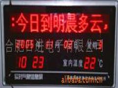 产品规格:1.采用BM12088BS型8*8(φ3)红色超高亮点阵32个、点阵尺寸:32*32;2.汉字显示尺寸:64*64,单行显示汉字数量8个;3.采用科大讯飞语音芯片,信息语音功能。 主要性能特点:1、该电子显示屏选用工业级的单片机与GSM通讯模块电路设计,性能稳定可靠,操作简便。 2、选用钢化玻璃面块和悬挂式设计,外观华丽且易于安装。 3、电子显示屏具有短信息显示、时间显示和实时温度显示功能。收到的短信息可多条自动循环地显示在汉字跑马灯显示屏上。 4、内置高精度温度传感器,实时采集和显示当前环境温度。 5、内置高精度时钟,日误差不超过一秒,可以按钮自动调控。 6、断电时,系统自动保存所有信息并继续走时,再次来电时系统自动恢复信息显示。 7、系统内部共6条短信储存区, 400多个汉字已循环走动的方式可同时显示在显示屏上。 8、该电子显示屏可为各类气象信息提供不同提示信号音,其他短信发送到电子显示屏上以四次提示音,提醒用户有新的信息到来,气象警报发送到电子显示屏上,第一次是十次提示音,隔半小时、一小时各提醒一次,每次提示音五次。9、信息语音报读。10、可大量应用于宾馆、酒店、商场、会交车、办公楼厅、人员密集场所及重点防灾减灾区域的气象信息、气象警报服务或当地的信息提示服务。