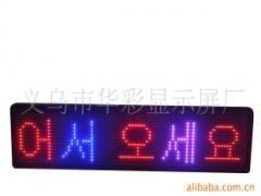 义乌市华彩显示屏厂是华彩光电有限公司下属的专业研发生产LED显示屏的高新科技企业,是LED显示屏领域真正具有显示屏核心控制系统研发实力的企业。产品品种齐全,多项产品均通过认证。 本产品广泛应用于机关单位(如证券、税务、电力、医院、港务、银行、车站、学校、工厂等)的信息公告场所,商业广告、门楣招牌以及各类移动环境下的图文显示和广告。 本产品基本组成:优质磨砂面铝框+红蓝LED模组+控制卡+标准双面铝后板+CE认证的5V开关电源 基本配置:多国语言软件232接头连接线 本产品规格:实际尺寸136厘米*33厘米*9厘米包装尺寸140厘米*36厘米*10厘米 售后服务:非人为和电源超压引起的,免费保修一年。保修期过后需要维护的,我方只收取成本费用。 本产品特点:红蓝紫色高亮显示鲜艳亮丽适用于各类挂装场合、出租车显示屏广告和作为各种分立组合的商品柜、货架等产品的配合产品 为了进一步开拓市场,本着"信誉第一、质量至上、创造品牌、高效服务"的宗旨,及“专业、专注、创新、共赢”的经营理念,我公司以“综合性能最高,价格最低”的原则,向全国同行及经销商提供我公司在行业里最具优势的显示屏及所有产品配套材料的批发业务,并为全国各地客户免费提供整套生产解决方案及技术支持。欢迎订购!现诚征各地代理商及批发商。同时,惠待各类业务引见!企业热线:0579-85625395 13777913505 销售QQ: 474367218 460676670 Email:led8899@126.com