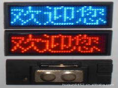 产品型号:B1236B简介: ☆功能简介 ★速度:0~5级可调各种显示速度。 ★亮度:25%,50%,75%,100%四级亮度调节 ★显示方式:保持,闪动,跑马灯,飘雪。 ★颜色:红光、兰光、黄光、绿光、白光五种LED颜色可供选择。 ★容量:可储存8条独立讯息,每条信息最长可达250个英文字符,总容量可存625个汉字,相当于1300个英文字符。 ★接口: 连计算机USB端口,计算机自动识别,无需手动找端口。 ★内置十条常用动画图标,“闪动的心”、“闪动的电话”“QQ笑脸”“箭头”“闪烁星”……,改变显示方式/亮度/速度等。在同一个软件界面中就可以自由智能的切换中日韩英等国家语言版本。 ★编辑:直接输入文字,LOGO图片,软件自带图片编辑器,可以方面的制作LOGO图标。 ★电池:内置高性能安全聚合物充电电池(工厂定制),连接线插入计算机USB端口即可充电。 ★配: 两种方式,一种是显示器后方有磁铁座,方便夹在衬衫或外套上。一种是采用安全别针方式,再厚的衣服,再剧烈的运动都保证不脱落。点阵:12X36像素英文、中文、繁体中文韩文、日文、俄文等最大可显示英文1500个字符,中文675个字符,6条文本信息,2个图文信息开关按键,四级亮度调节25%、50%、75%、100%。5级速度调节,即文字显示速度可快可慢。11个动画图标。净重30g,毛重:100g整屏体积(mm):45.5(H)x90(W)X5-11(T)包装:每盒一片,配光蝶,通讯线包装盒体积:105mmX43mmX190mm充电时间: 2-3小时,宽电压:AC110-220V工作时间: 16个小时当亮度在25%时电池类型:可充电聚合物锂电池,240mAh通过USB线可直接从电脑下载信息,并充电,也可通过充电器充电