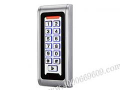 产品简介:本产品为非接触式感应卡金属密码门禁一体机,根据型号不同分别支持MF、HID、MIFARE三种感应卡,是目前最先进的单门门禁控制器之一。它采用独特的金属外壳设计,灵巧的键盘面板操作,内置高档微处理器,抗干扰能力强,安全性和可靠性极高,可为2000个用户提供强大的安全保障。它具有超低功耗、夜光键盘、独立密码、韦根输出、输出短路保护、门磁报警、防拆报警、开门按钮、门铃接口、安全级别设置等强大功能,使用非常方便,可广泛应用于家庭、办公室、住宅小区及其它公共场所。功能特点:超低功耗:待机电流小于30mA。夜光键盘:夜晚也能操作键盘。用户容量大:支持2000个用户。独立密码:可使用与卡无关的密码开门。用户修改密码:用户可自行修改开门密码。搜索速度快:刷卡至开门时间小于0.1S输出短路保护:电锁或报警输出短路时100μS内自动关闭输出。韦根输出:带有维根输出接口,能输出Wg26卡号或Wg4按键号。可用键盘删除卡号:卡丢失后可用键盘删除该卡,彻底消除安全隐患。防拆报警:非法拆机后内置蜂鸣器发出报警音。有门铃按键和接口:按键与电路隔离,可外接任何门铃。技术参数:工作电压:DC9-28V静态电流:≤30mA读卡距离:3~8cm存储容量:2000个用户环境温度:-25℃~60℃环境湿度:10%~90%电锁输出:≤3A报警输出:≤20A输出短路保护时间:≤100μS开门时间:0~99秒(可调)外形尺寸:120 *56*18mm产品系列: