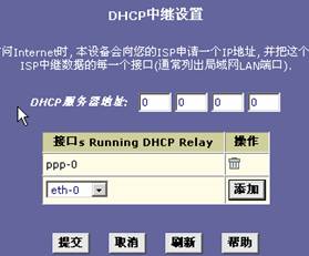有可能我们的ISP为家庭用户或小型办公网络提供了DHCP服务器功能,这时,可以将ADSL Modem配置为一台DHCP中继代理服务器使用,当本地的网络中有一台计算机准备访问因特网时,ADSL Modem就会连接ISP来申请获得一个IP地址和其它的信息,然后将信息回传到这台计算机上,以下这些方法是用来配置DHCP中继代理的。