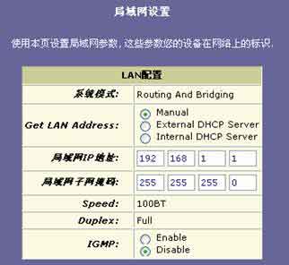 本页内容主要是对modem局域网接口使用的IP地址进行设置。如下图12中所示。对于modem局域网接口所使用的IP地址,有三种不同的方式来获得。第一种方法是手工指定,那我们要在“Get LAN Address”一栏中选择“Manual”选项,让自己来指定一个IP地址。手动选项是默认的设定值,在modem出厂时厂家都为其指定了一个固定的保留地址(如192.168.1.1)。然后我们就须在下面的两栏中分别填入自己指定的IP地址和子网掩码。在这个页面中,我们还可看到modem局域网接口的连接速度和工作模式,像笔者的modem,它与交换机的连接速度是100 M,全双工的工作模式。在下面的IGMP选项中,我们选择默认的Disable就行了,一般不用进行改动。