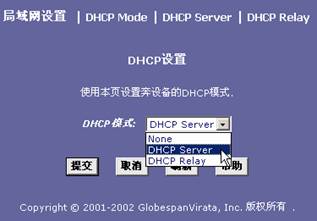 我们可把这台ADSL Modem配置为一台DHCP服务器、DHCP中继服务器或DHCP代理,或者禁止使用DHCP服务器模式。