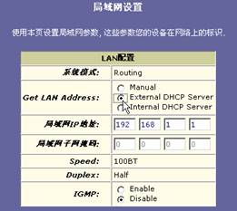 如果在我们的网络中已经有另外一台电脑或其他设备有了DHCP服务器的功能,那么我们也可以配置ADSL Modem的LAN口作为这台服务器的DHCP代理。当把ADSL Modem配置为DHCP代理时,对于局域网中的计算机来说它本身能作为一台DHCP服务器使用,但对于它自己的LAN口却不能应用。具体的设置是在“局域网设置”中,选择“External DHCP Server”(指从ISP处获得IP地址)或“Internal DHCP Server”(指从内部局域网的DHCP服务器处获得IP地址)。如下图14所示。
