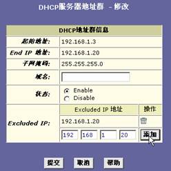 在我们想要修改IP地址的相应地址群中点击 ,进入“DHCP共享服务器-修改页”页面中,在“Excluded IP”框中输入你想要禁用的每个IP地址并点击“添加”按钮,当输入完后点击“提交”按钮。例如,我想要禁用IP地址192.168.1.20,修改后如下图17所示。