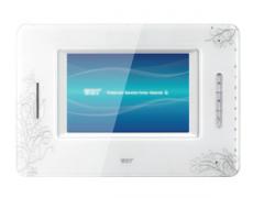 输入电压:+DC18V湿度:45%--95%存储温度:-15—55℃灵敏度:≤20mV失真度:≤5%显示像素:384000dots工作电流:≤350mA±20%静态电流:≤200mA±20%(LCD屏关闭)输出功率:≥50mW显像时间:振铃到接听自动关机时间约85—180S联网接口:RJ45网络传输方式:TCPIP产品尺寸:255x178x32mm传输距离:100米内可接至路由器或交换机,100米外加光纤收发器 | 1,7屏LCD数字显示屏,可监视入口状况及对来访客户进行二次确认2,远程开锁3,可呼叫管理中心并直接通话,可紧急报警到管理中心4,可呼叫局域网内其他住户并对讲5,和旋振铃声和静音设置6,呼叫电梯功能7,住户托管8,家居设备控制9,支持语音、图片、短信等信息的查询10,可接收中心支持的便民服务11,并机功能,每户最多可4台该类型分机并接12,支持远程升级电器的状态(扩展); |