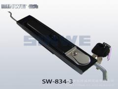 产品型号:SW-834-3材 质:锌合金基座、带挂手柄、转轴套、齿轮盒、传动轴,Q235锁片、长短齿条、齿轮,不锈钢螺丝,挂钩表面处理:喷黑油基座、带挂手柄,镀环保彩锌转轴套、齿轮盒、传动轴、锁片、长短齿条、齿轮,不锈钢本色结构说明:长条形多功能锁,钥匙顺时针旋转90°,手柄弹起,逆时针旋转手柄,长短齿条回缩,锁片逆时针旋转90°进入开启状态,钥匙有自动回位功能,手柄带有后上锁。调换定位片可实现左右开门。备 注:默认配钥匙两支+三角工具钥匙用 途:适用于配电柜、通信柜、仪表箱、控制箱等各类机箱机柜