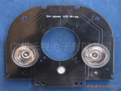 SH-2420A基本参数1、输入电压:DC9V-25V2、灯板尺寸:外径为93×83mm,镜头内孔为Ф32mm3、通过电流:420mA-1200mA4、红外灯数量:2颗超大功率灯5、红外功率:5W6、夜视距离:70-80米7、波长范围:850nM8、适配镜头:4mm、6mm、8mm、12mm、16mm9、红外灯杯大小23×14mm10、灯杯角度15、30、45、60、80度11、适配外壳:侧开护罩第三代阵列式红外灯板采用第三代阵列式红外灯,特殊的长晶工艺及封装方式,晶片的光电转换效率极高,是普通阵列式的2倍以上,散热小,寿命是传统LED的5-10倍,2年之内人眼几乎无法看出照度衰减,质量等级为军工级,简单说,正常使用是不会坏的。可视距离远,发光均匀,寿命长,体积小,将成为CCD监控导向性的产品。单个灯夜视距离为80米。采用恒流设计,红外灯在9-15V之间能正常工作;选择阵列式摄像机的五大理由1.亮度高:单LED Array 的输出约为1W-20W ,亮度约是常规单LED的输出5-15mW的数百倍,所以产品的射距远。2.效率高:普通红外LED的电光转换效率公为10%左右,而LED Array电光转换效率提升为25%。3.体积小:LED Array为高度集成芯片,所以在相同亮度指标下其体积比其它红外产品小很多。4.寿命长:LED Array寿命为10000H,比普通LED寿命为1200H高出9倍,试想:付出约相同的代价而取得五到十倍寿命的产品,有谁不愿意?5.光线匀:LED Array 发光体半功率为10度-120度(可变角)的发光面,解决了普通LED在夜视画面形成中间过亮而两边过暗的“手电筒效应”红外摄像机发展过程对比第一代:传统LED它是目前使用最普遍的零件,几乎占有95%以上的市场,但品质参差不齐,所以价格差异也大,从人民币3角到1元不等。但由于:1、传统LED散热处理不良,造成周遭温度太高而影响附近电子元器件的寿命(如摄像机板,控制电路板等易坏且寿命缩短)。2、最为人垢病的是它的光衰减太快,一般不到一年就看不清夜视画面了。传统LED用“环氧树脂”作为透镜的材料,但“环氧树脂”遇热后会产生断裂,随着时间长了,断裂面就愈来愈多。红外光线通过每个断裂面时,有部分光穿过了,也有部分光折射回头了,通过的断裂面愈多则折射回头的光就愈多,出去的光就愈少。这就是为什么传统LED光衰减特快、寿命特短的主要原因(请参考附图1、2所示)。若改采用其它不断裂材料(如硅胶)取代环氧树脂,则其生产成本将超过现在的数十倍以上,从而完全失去了市场竞争力。第二代:小功率阵列式LED它集成了多颗小功率LED在一个小范围内,并作了“热电分离”处理,使得整个零件能置于任意大小、任意形状的散热体上,从而解决了散热问题,不再会由于高温而伤害了周遭其它电子元器件。又由于使用的封装材料不断裂而极大的减少了光衰减,寿命较传统LED长了5-10倍。但:1、小功率阵列式LED的价格较传统LED高出甚多。2、为了配合摄像机镜头的角度而使用透镜来缩小送光角度时,无可避免的有许多发光点偏离了透镜的中央(俗称:偏心现象)而造成送光效率不佳,以致相较于相同功率的传统LED而言,“不够亮“是其缺点。第三代:大功率阵列式LED它既有第二代体积小,散热处理好,寿命长的优势,又解决了因偏心现象而不够亮的缺点。大功率阵列式LED的价格接近或低于传统LED。这是集第一代、第二代优点于一身,并完全避免了缺点的最新一代红外发光元器件。我们乐观的估计它将是今后红外夜视所采用的主要元器件,试想:有谁愿用约略相同的价格去买1/5或1/10寿命的产品?