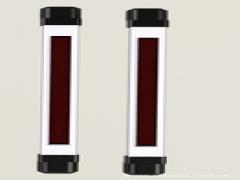 产品特点及功能l防小偷于户外,更安全。l安装于户外,不影响户内活动,二十四小时不间断值守。l采用太阳能、无线技术,节能又不破坏装饰。l采用对射原理,解决了普通报警器容易误报的问题。l具备多光束,防范度高。l具有故障自检,并向主机报告功能。l抗强光干扰,并有干扰提示。l无线调频+跳频信号报警,解决了无线信号容易被干扰和误收误报的问题。l采用二次调制编码的光信号,避免多对光墙之间的红外光相互干扰问题。技术参数·工作电压:3.3V·储电类型:可充磷酸铁锂电池·电池容量:发送端500mA,接收端500mA·静态工作电流:4光束太阳能红外栏栅发送端≤0.6mA,接收端≤0.6mA8光束太阳能红外栏栅发送端≤1mA,接收端≤1mA·红外光频率:38KH2基础上进行二次调制编码·红外光波长:940nm±20nm·红外光束数:4光束、8光束·无线发射频率:调频433MHz·红外距离:实用6米·无线发射距离:开阔地100米·太阳能电板输出电流:4光束太阳能红外栏栅1600Lx光照情况下≥1mA(注:普通雨天户外光照度约2000Lx)8光束太阳能红外栏栅1600Lx光照情况下≥2mA(注:普通雨天户外光照度约2000Lx)·工作环境适应温度:-30℃~70℃·24小时最大触警次数:≤50次·外型尺寸:4光束太阳能红外栏栅620×48×56(mm)8光束太阳能红外栏栅1120×48×56(mm)