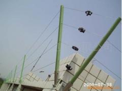 脉冲电子围栏的安装要求一、系统前端总示意图 如图整个系统的前端由防区探测器,终端杆,终端杆绝缘子,终端杆绝缘子固定夹,PV挂线杆,PV挂线杆绝缘子、挂线杆底座,转角杆,转角杆绝缘子,紧线器,线-线连接器,警示牌,避雷器,18#合金丝,高压绝缘导线,及电源线,通讯线等组成。二、电子围栏按其在现场的安装位置,主要分为独立式、墙顶式两类。一、独立式电子围栏 独立式电子围栏,直接安装在地面上。由于其高度达2米以上,导线数达12-20线,所以,导线对终端杆的张力较大,因此,终端杆必须有足够的强度,终端杆的埋设必须稳固。如果土质坚实,可直接将终端杆的下端埋入地下600mm作固定。如果土质较松软,则应埋入混凝土基础之中,增加其稳定性。如果终端杆的刚性不够,应增加支撑(下图)。终端杆间最大距离:60m。 挂线杆,虽不承受导线的张力作用,但必须支持众多导线的压力,因此,也需要安装的稳固。同样可采用埋入法安装。挂线杆间最大距离5m。墙顶式电子围栏墙顶斜向安装墙顶侧向安装墙顶式电子围栏,直接安装在围墙顶部。终端杆、挂线杆的安装,可采用预埋方式,直接用电锤在墙顶打孔(深度约25CM,终端杆孔¢50挂线杆孔¢20),先将水泥浇入孔内,然后将杆插入。如安装在墙体侧面可以有打膨胀钉、安装金属底座等方式,采用竖直向上安装方式可以直接用膨胀螺钉固定,而采用一定倾斜角度安装方式时,应先将金属底座固定在墙上,然后将挂线杆插在底座中,用螺栓锁紧。