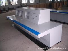 结构:控制台坚固耐用,防尘,防盗,防火,防潮;造型新颖、美观大方、标准化设计;可采用19”标准或非19”标准,适用于各类专用监控设备的安装使用。台面可采用高密度防火板制作,实木包边等,坚固耐用,豪华大方。每位配高速散热排风扇,万能电源插座,标准层板。分左右结构,可单联,双联,多联组合一起,方便运输安装。控制台是监控系统项目工程的首选设备。控制台下面的柜子为19”标准或非19”标准机架式结构,可装电脑主机,工控机箱,硬盘录像机等设备每位设备层之间相通,方便走线。控制台下面的柜子为19”标准或非19”标准机架式结构,可装电脑主机,工控机箱,硬盘录像机等设备每位设备层之间相通,方便走线。用途:控制台是安全防范监控工程的首选产品,安全符合计算机安全消防条例。广泛应用于广播电视,公安,交通,消防,银行,电力金融,机场,智能大厦,高速公路,电力,军事,政府机关,行政事业单位,保安等监控工程。