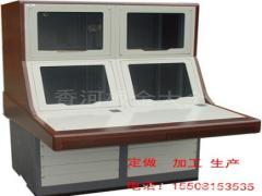 工艺特点及性能 1. 控制台设计严格遵循人体工程学。 2. 整体外观流线造型,设计创新、结构合理、加工精细简洁、流畅、现代、美观大方。 3. 各部位尺寸均依据人体工程学经过精确计算,所有角、边均设计为弧线过渡,既保证操作安全舒适又方便操作。 4. 控制台内均按国际电工标准安装,适用于通讯指挥、调度中心、保安监控、广电等领域具有较强的通用性。运输方式:我们用专线物流这样能保证货物的安全,避免一些不必要的损坏,物流费用请您联系我。我会给您解答。联系方式:联系人:康鑫电话:15508153535QQ:712368085 5. 控制台内各单元互相贯通,走线方便. 6. 侧板、台面板、前扶手等均可选为木制材料或钢质材料,色彩丰富,其余均为优质冷轧钢板。 7.表面处理:去油、磷化、电泳底漆、静电喷粉。 8.可根据客户要求进行结构设计。并可设计加工成弧形或转角结构。 9此操作台由钢板弯制而成,两侧和上部由优质木板式高级密度板装饰组成豪华型操作台。10 台体上部立面可安装各种显示器,台面可安放各种仪器等,台面下安装优质塑料键盘盒。11 台底部为机箱部分,可安装工控机,微机主机,横式、竖式均可,台体后部可安放UPS电源等,后部还可安装19"机箱。 材料:1.2-2.0mm优质冷轧板,采用不锈钢台面,美观大方 表面:酸洗、磷化、静电喷涂 特点:造型美观、结构合理、设计充分考虑用户要求和现场需要。