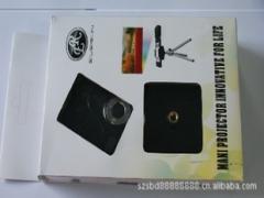 产品描述:本产品是苹果标准配件,内用苹果原装解码芯片,可以非常流畅的输出视频图像进行播放。产品最大功耗为450MA以下(声音最大状态).开机的初始电流设在350MA左右,可以完整播放两部电影且还预留20%以上的电量供苹果使用。镜头设有调焦功能,通过调焦来调整图像的清晰度;可以取代标准的苹果AV线,取代IPOD的外部音响,且可取代苹果标准充电器(用普通充电器连接就能充苹果了)。适用于儿童学习,时尚白领,业务精英.旅游外出露营等。操作方法:一:产品可根据苹果机供电与外部USB供电的先后选择其使用性能。 1:先由苹果设备供电(此时再插入USB充电苹果同样视为先苹果设备先上电),则上电10秒内产品需要同苹果设备进行相互认证过程,当电源LED闪烁3下时表示认证通过,苹果便可以视频输出了,此时就可以进行相关的投影或连接电视等视频播放动作了(在产品同苹果认证期间可以播放歌曲,但如果要播放视频文件则没有视频输出)------标准的供电方式。 2:先通过USB供电再插入苹果方式,此时产品就相当于是个音响+充电功能,此功能主要是为方便用IPOD用户要用本机的显示屏来看视频时有外接音响功能------省电模式播放。二:产品的按键使用方式: 1:产品的按键是复合键设计,每个按键都有轻触发和长按键功能(紫色为长按键功能---长按1.5秒启动,黑色为短触发功能)具体见图(可以通过按键来直接操控苹果):值得提醒的是:在只播放音乐文件时不要打开投影功能,这样可省50%以上的工作电量,延长播放时间;具体有电源指示灯提醒(当电源LED一闪一闪的情况下表明投影部分处于工作状态)三:产品的应用范围:设计理念三大功能三大特点,具体如下: 1大功能:可以直接由苹果供电投影,(操作方式详见“供电先后选择其使用性能说明第1小项”)。主要用于家庭娱乐和外出娱乐,例如在外露营,晚上可以直接将其图像投射到白色帐篷上看电影,可以用普通的充电器充苹果设备。2大功能:可以将苹果内的图片文件视频文件输出到家庭影院来播放,更加清晰的观看自己的所拍和电影。3大功能:可以将多媒体的视频由本产品微投出来,使其有图像有声音。例如一个家庭没有多余的电视或电脑,小孩要学习光盘的话,就可以用此产品连接VCD或DVD等多媒体产品输出AV信号直接投影,这样就不会因为电视等视听设备不够而造成耽误小孩学习了同时也满足大人的娱乐需求。4为三大特点:可以取代苹果的AV连接线,取代苹果外响,取代苹果充电器。四:配件: 1:主产品(投影仪) 2:苹果夹子。 3:三脚架。 4:标准的USB连接线。 5:标准的AV连接线。