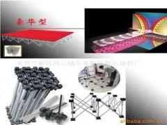 便携式折叠舞台:又称拉网式舞台,就是能够随时折叠随时展开的舞台架子,折叠舞台便于安装,携带方便,是企业参加展览或国外演出必备的展览工具。目前折叠舞台有铁杆和铝合金两种,价格比铁杆的要贵些。折叠舞台能够反复使用,承受力强,不易损坏。折叠舞台的高度不等,企业可以根据自己的需求预定。规 格:高度30cm-120cm 都可定做1.500*500mm(塑件中心对中心),高度500—1200mm之间都可以生产。2.圆管壁厚1.2mm,管直径19mm,3.方管规格25*25mm,壁厚0.8mm4,每平方可以承重500—600公斤。6.材质:铁管,表面喷塑。7.重量:13-15公斤/平方8塑料件材质为ABS工程塑料,保证舞台连接件抗摔,耐磨,坚实,不易损坏。9.表面承重材料可使用透明钢化玻璃、装饰木地板、木板铺地毯等。广泛应用于国际性大型车展、文艺演出、时装发布、商品推广等领域。