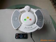 1.产品外形尺寸:216×193×55mm彩盒外形尺寸:260×225×75mm重量:0.9公斤包装配件:①音乐舞台灯1台 ②万向支架1个 ③AC电源1个④USB线1根 ⑤遥控器1个 ⑥使用手册1份2.电源: 输入100~240V AC 50/60 Hz, 输出:5V DC 1.5A3.音乐播放格式: MP3. 容量:1G.4.喇叭功耗: 3W×25.雷射功率: 红光镭射650mm<100mW, 绿光镭射532nm<50mW6.工作温度: +10°~ +40°.7.储存温度: -10°~ +60°操作说明(1). 接上DC5.0V/1.5A电源,按电源ON/OFF(上面图示2)。(2). 按镭射ON/OFF(上面图示7),产品会发出红色+绿色镭射满天星光点,连续工作1小时后镭射光会自动熄灭,按此键便可再次打开镭射。(3).MP3播放/暂停: 按第一次” MP3播放/停止”键播放MP3音乐;按第二次暂停当前的音乐播放,按第三下便可播放上次暂停的音乐;长按(一直按住按键不放)2秒钟音乐停止播放。(4).上一首(上图示5)/下一首(上图示4): 播放器按操作播放上/下首音乐。(5).音量旋钮: 顺时针转动为音量增大,逆时针转动为音量减小。(6). 镭射模式转换按键: 此按钮为不同镭射光模式选择,默认模式为MP3音控模式,(激光会随音乐的节奏而产生闪烁), 按此按键第一次,满天星光点均速移动,按此按键第二次,满天星光点静止不动,按此按键第三次,满天星光点变化恢复到默认状态模式。(7). USB:产品通过USB连接线和电脑进行连接,拷贝MP3音乐数据(可当U盘使用)。(8). 遥控器:使用遥控器时,需将遥控器对准产品上的遥控接收器,有效控制距离约10米,产品上的遥控接收器的有效接收角度为±15°,超出此角度将会影响遥控效果;使用遥控器调节音量时,需将产品音量旋钮调到最大声位置,这样才能正常遥控音量大小,遥控器按键功能详见附图二。(9). 第一次使用遥控器时,需将透明垫片取出方可使用。