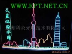冷光线,EL发光线,冷光眼镜柔性霓虹线是国际发光显示照明领域新一代产品,外形与普通电话线相仿,表层为彩色荧光塑料套管,其工作时发光连续无任何热辐射,耗电量只为LED灯的50-70%,为串灯的20-40%,为霓虹灯的1-10%;本产品是在中国国家科技部创新基金支持下,由上海KPT公司研制并生产,该类产品开创了节能、环保、健康照明显示的新时代。应用领域:1、户内外广告,文字图案,橱窗、门、家具、墙壁、屋顶等2、车、船等交通工具装饰:内外装饰、仪表指示、数字显示3、安全标记与指示:楼梯、通道、门牌、出口、临时户外危险场地警示4、玩具、工艺美术品、体育用品、服装、电器、装修、军事装备等基本特点为:1)柔性霓虹线发光均匀细腻,色彩亮丽,颜色丰富。工作与非工作状态下立体与透视感强烈,外表与发光颜色高度统一,同时适合昼、夜观察。发光线产品发光柔和,不会对人类或其它动物视觉产生刺激和眩目,更不会对植物生长产生不利影响,尤其适合人类夜间视觉观察。如:将其制成汽车门发光线,夜间车门打开时整体门的边沿笼廓发出彩色闪光,远距离观察清晰安全。将其布置装饰于树木、草丛表面,可以产生美化夜市效果。2)柔性霓虹线具备节能、环保、健康特点。电致发光线功耗较低,适用电压范围广( 3V—220V ),工作时无热辐射产生,可以大量节约我国的电力能源;按电致发光线现有状态只应用于户内及户外低矮建筑装饰,就可节约现有城市夜间装饰性耗电量的15%。电致发光线的大量应用可以有效降低城市环境温度,该产品使用与废弃时均不会产生任何环境污染,尤其可以有效防止大城市中极为严重的光污染。由于发光线使用时工作电流极小,所以不会对人体发生危险。3)柔性霓虹线具备柔软、可折叠弯曲,随意打结、裁减、拼接等特点,而不会影响发光性能。柔性霓虹线柔软度如普通电话线,其折角可以大于15度,弯曲可以实现360度,并且其可以反复折叠弯曲打结。柔性霓虹线长度根据实际使用需要能够随意剪接,首尾发光亮度与均匀性不会发生变化。4)本产品为连续性发光器件,360度全角度多色彩发光,其可以单色或多色组合,根据电路控制与匹配实现各类动态闪烁。其形状可以有多种如:方形、圆型、半圆形、扉边型等。也可以实现单芯或多芯组合,从而增强发光强度或多色闪烁。其直径可在0.7-20mm间,或更大。5)柔性霓虹线品可以直接使用透明胶带、胶水、别针、线钉、透明塑料卡等固定于装饰物体表面。应用如:玻璃、橱窗、家具、门窗、墙体等处,其使用方便快捷。还可以使用扉边型缝扎于布料、皮革、服装表面及边缘。。。