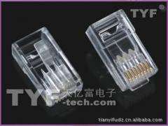●采用阻燃性PC塑料,镀金可为01、03、06、15、30和50●插拔次数≥1000次●符合ROHS标准●Made of anti-burn PC(UL94V-0),gold plating(01,03,06,15,30or50)●Frequency of use over 1000●Achieved ROHS and environmental protection standard满足超五类传输标准,用于设备间或水平子系统的端接 水晶头起源 RJ是RegisteredJack的缩写,意思是“注册的插座”。在FCC(美国联邦通信委员会标准和规章)中的定义是,RJ是描述公用电信网络的接口,常用的有RJ-11和RJ-45,计算机网络的RJ-45是标准8位模块化接口的俗称。在以往的四类、五类、超五类,包括刚刚出台的六类布线中,采用的都是RJ型接口。在七类布线系统中,将允许“非-RJ型”的接口,如2002年7月30日,西蒙公司开发的TERA七类连接件被正式选为“非-RJ”型七类标准工业接口的标准模式。TERA连接件的传输带宽高达1.2GHz,超过目前正在制定中的600MHz七类标准传输带宽。 IEC(60)603-7也是ISO/IEC11801国际通用综合布线标准的连接硬件的参考标准。ISO/IEC11801标准关于连接硬件需求的规定:信息插座连接处的物理尺寸参考IEC(60)603-7,8针‘RJ45’标准。信息插座的电缆端接导体数量为8。因此,使用6针或者4针接插件(比如RJ11)从此不被通用解决方案支持。水晶头分类RJ-45RJ-45接头:每条双绞线两头通过安装RJ-45连接器(俗称水晶头)与网卡和集线器RJ-45水晶头(或交换机)相连。 RJ-45插头是一种只能沿固定方向插入并自动防止脱落的塑料接头,俗称“水晶头”,专业术语为RJ-45连接器(RJ-45是一种网络接口规范,类似的还有RJ-11接口,就是我们平常所用的“电话接口”,用来连接电话线)。之所把它称之为“水晶头”,是因为它的外表晶莹透亮的原因。双绞线的两端必须都安装这种RJ-45插头,以便插在网卡(NIC)、集线器(Hub)或交换机(Switch)的RJ-45接口上,进行网络通讯。RJ11RJ11接口和RJ45接口很类似,但只有4根针脚(RJ45为8根)。在计算机系统RJ-11水晶头中,RJ11主要用来联接modem调试解调器。 日常应用中,RJ-11常见于电话线。其它 还有一种RJ12通常RJ12水晶头也适用于语音通信的,结构和前两种一样,但是有六根针脚(6p6c)。同时还衍生出六槽四针(6p4c)和六槽两针(6p2c)两种。晶头起源 RJ是RegisteredJack的缩写,意思是“注册的插座”。在FCC(美国联邦通信委员会标准和规章)中的定义是,RJ是描述公用电信网络的接口,常用的有RJ-11和RJ-45,计算机网络的RJ-45是标准8位模块化接口的俗称。在以往的四类、五类、超五类,包括刚刚出台的六类布线中,采用的都是RJ型接口。在七类布线系统中,将允许“非-RJ型”的接口,如2002年7月30日,西蒙公司开发的TERA七类连接件被正式选为“非-RJ”型七类标准工业接口的标准模式。TERA连接件的传输带宽高达1.2GHz,超过目前正在制定中的600MHz七类标准传输带宽。 IEC(60)603-7也是ISO/IEC11801国际通用综合布线标准的连接硬件的参考标准。ISO/IEC11801标准关于连接硬件需求的规定:信息插座连接处的物理尺寸参考IEC(60)603-7,8针‘RJ45’标准。信息插座的电缆端接导体数量为8。因此,使用6针或者4针接插件(比如RJ11)从此不被通用解决方案支持。水晶头分类RJ-45RJ-45接头:每条双绞线两头通过安装RJ-45连接器(俗称水晶头)与网卡和集线器RJ-45水晶头(或交换机)相连。RJ-45插头是一种只能沿固定方向插入并自动防止脱落的塑料接头,俗称“水晶头”,专业术语为RJ-45连接器(RJ-45是一种网络接口规范,类似的还有RJ-11接口,就是我们平常所用的“电话接口”,用来连接电话线)。之所把它称之为“水晶头”,是因为它的外表晶莹透亮的原因。双绞线的两端必须都安装这种RJ-45插头,以便插在网卡(NIC)、集线器(Hub)或交换机(Switch)的RJ-45接口上,进行网络通讯。RJ11RJ11接口和RJ45接口很类似,但只有4根针脚(RJ45为8根)。在计算机系统RJ-11水晶头中,RJ11主要用来联接modem调试解调器。 日常应用中,RJ-11常见于电话线。其它 还有一种RJ12通常RJ12水晶头也适用于语音通信的,结构和前两种一样,但是有六根针脚(6p6c)。同时还衍生出六槽四针(6p4c)和六槽两针(6p2c)两种。