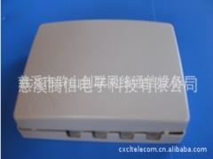 桌面盒产品简介 光纤桌面盒,采用ABS塑料分别制造盒体底板和盒体盖板,盒体盖板与盒体底板以滑槽结构套接;在盒体底板的下部分中间设有两个盘纤凸台,盘纤凸台的周边为盘纤槽;在盘纤凸台左侧的盒体底板边缘设有双位光纤适配器安置孔和双位光纤适配器固定栓;在盒体底板上方的中间设有两个并列的冷接子嵌位槽,冷接子嵌位槽的左右两边各有两道尾纤或皮线光缆出线槽,盒体底板上设有盒体固着结构;本发明的积极效果是:结构小巧美观,充分利用了冷接子的结构特征,输入的尾纤或皮线光缆可直接与输出的尾纤接续,能固定或者活动使用,极适合营业、办公场所或居家使用;且结构简单,成本低,制造和使用方便,易于大范围推广应用。光纤面板