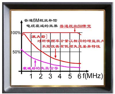 3,普通放大器的特性是:在6M有效带宽内,对所有频率分量提供相同的增益。用这种放大器作信号补偿,显然无法补偿视频信号的频率失真,也就无法改善图像质量。(见右图)