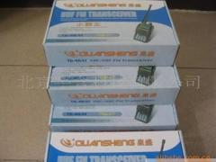 泉盛小霸王TG-46AT简介泉盛精品小霸王TG-46AT采用优质进口机心,品质可*,灵敏度非常高。天线改进了小金刚的不足,采用先进的SMA接口的加感天线,信号更好,通话更清晰。400-470MHz全部覆盖手持机,带哑音频防止干扰,人性化设计,智能语音提示准确操作!*超小型大电池国产手持机,物美价廉*超宽频率范围:400MHz-470MHz,无论是民用频段、业余频段,还是专业频段,全部覆盖!*带键盘型,手动输入频率*功率大小可调,且可设定某个信道大或小功率*最大功率5W,最小可设定为1W*特有的语音(人声)提示功能*可以设定自动扫描*内置CTCSS哑音频功能*5、10、12.5、25KHz四档不同步进值设定*可以设定"CH/CH+频率/频率"三种状态*带键盘锁功能,防止误触发*可以设置任意异频,适合各种中继频率*具有绿色背光功能,时尚新颖*配备1100mAh/7.2v大容量镍氢电池频率范围:400.00-469.9975MHz*频率步进值:5、10、12.5、25kHz*频率稳定度:±5ppm(-15°C~+60°C)*调制型式:调频(16F3)*工作方式:同、异频单工*CTCSS编码:38个亚音频*天线阻抗:50Ω*天线接口:SMA(SMAJ)*发射功率:4—5W*杂波及谐波:≤-60dB*发射时电流:≤1600mA*调制频偏:≤±5kHz*灵敏度:<0.16μV(12dBSinad)*静噪开启灵敏度:≤0.15μV*音频输出功率:≥0.5W(8Ω)*音频谐波失真:≤10%*音频频率响应:300~3000Hz*接收时电流:≤300mA*守候时电流:≤18mA*配套电池组电压:7.2V(标称值)*配套电池组容量:1100mAh,镍氢*充电时间:8小时(座充充电电流约100mA)*待机时间:32小时*外形尺寸:80mm×50mm×28mm机身质量保修1年,配件6个月。