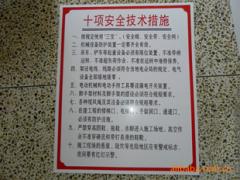 本产品采用进口PVC塑料板为料基,按《建设企业安全卫生标准》图样严格印制,耐酸碱、抗腐蚀,坚固耐用。设置在厂矿、建筑工地等应注意安全的场所,向人们敲响安全预防的警钟,对预防安全意识起了提高警惕性的重要作用。各种规格和材质欢迎订制和咨询:013858705275 057764592859 量大价格再议!郑重声明:我厂所用的PVC都是一级的新料,绝对不是回收料,如有假冒愿以一赔十。2、搪瓷标志牌:指在0.8mm厚度的铁板表面涂搪瓷釉,再经高温烧制而成。本产品具有耐酸碱、耐热震、耐高温、抗冲击、在室外阳光照射不褪色,不含任何对人体有害的元素等特点,广泛应用于化工、电力和电信等腐蚀性强或须把标志牌悬挂于室外的企业。3、反光标志牌(材料有铝质反光、PVC反光、不锈钢反光):就是在各种材料的表面上贴反光膜再丝网印刷而成。在白天以其鲜艳的色彩起到明显的警示作用,在夜间或光线不足的情况下,其明亮的反光效果可以有效地增强人的识别能力,看清目标,引起警觉,为黑暗中的行人或夜间作业人员提供最有效、最可靠的安全保障,从而避免事故发生,减少人员伤亡,降低经济损失。本产品一般用于公路铁路的导向牌、指示牌,矿山机场安全牌,地名牌、车牌、电力等企业。4、夜光标志牌(材料有铝质夜光、PVC夜光、不锈钢夜光):又称蓄光标志牌、自发光标志牌和长余辉标志牌,就是在材料的表面上直接用夜光漆丝网印刷或贴夜光膜再丝网印刷而成的标志牌。是一种吸收太阳光、灯光等光源的光线后在无光源的情况下可以自己发光,具有优秀的应急自动发光能力,有效地增强人的识别能力,看清目标,引起警觉,为黑暗中的行人或夜间作业人员提供最有效、最可靠的安全保障。本产品激发时间短,发光和余辉时间长,亮度高,极稳定的物理和化学属性,极强环境适应性,极长的使用寿命,安全可靠,节约能源,绿色环保被广泛地应用于城市导视系统中,例如目前的城市道路标识,消防警戒标识,矿井标识,交通导视标识,地下商场,宾馆,娱乐场所,公共交通,公用民建筑等各类重要场所和需要起夜光效果的企业等。
